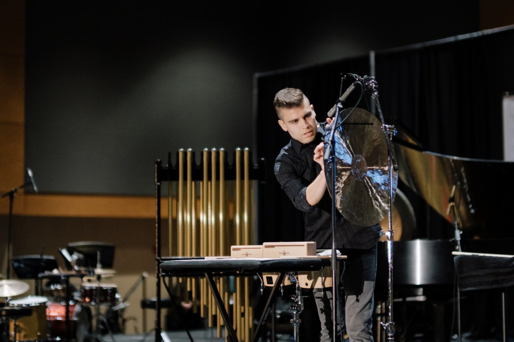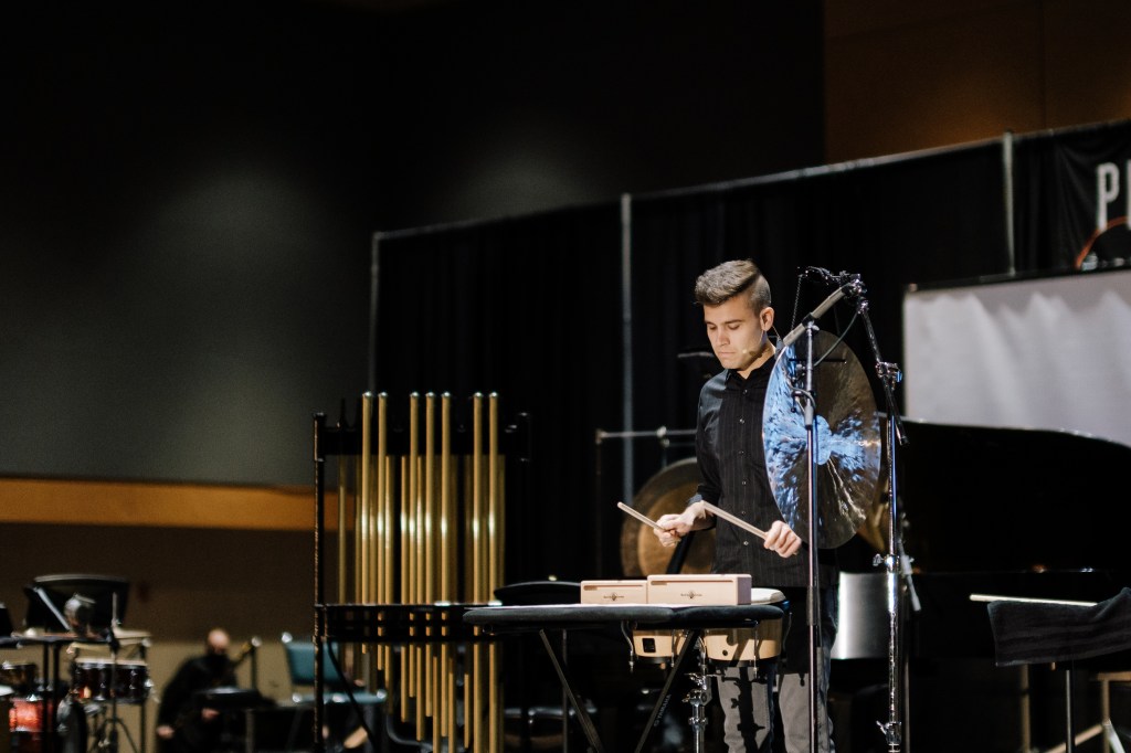 On Thursday, November 11 Alex was featured at the first New Music/Research showcase concert for the 2021 Percussive Arts Society International Convention in Indianapolis, IN. The theme for the concert was “poetic percussion.” He performed Rania Chrysostomou’s Τίλλειν for an intimate percussionist. The piece calls for bongos, two wood blocks, and wind gong, the latter of which the performer is asked to play with prescribed hand gestures while speaking Greek text authored by the composer. Check out some photos of the performance below!