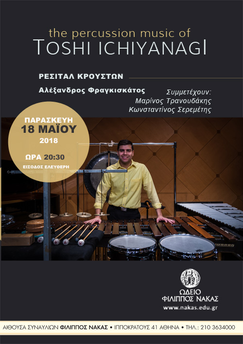 | 05.18.18 | The Percussion Music of Toshi Ichiyanagi Solo Recital Philippos Nakas Conservatory – Athens, Greece ![]() |