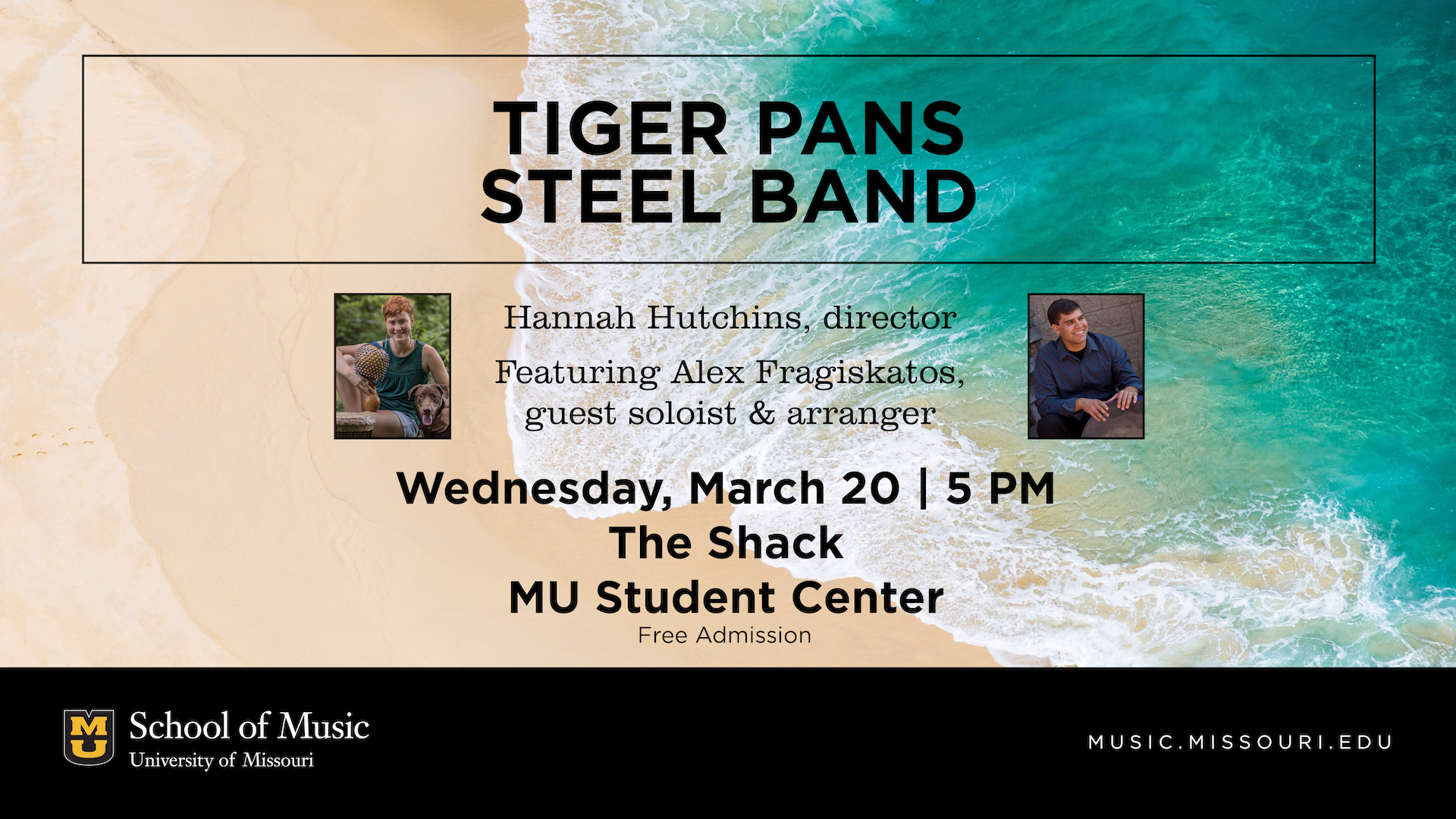 | 03.20.19 | Tiger Pans Steel Band, guest artist University of Missouri – Columbia, MO The Shack – MU Student Union ![]() |